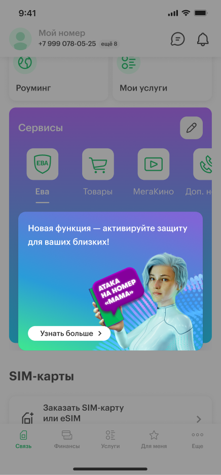- 2На главном экране в блоке «Сервисы» нажмите вкладку «Ева» и перейдите в раздел.